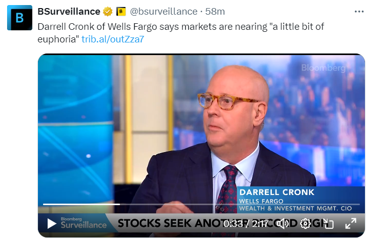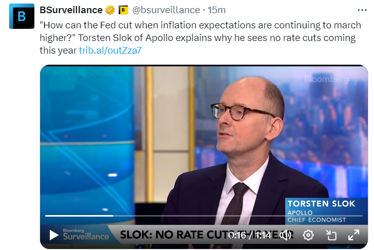 富国银行的达雷尔·克朗克指出,即使市场从预计将进行六次降息变为目前的三次降息,股市仍在继续猛涨。他说,如果共识跟随斯洛克的轨迹,并得出结论称2024年不会有美联储的救助,那么华尔街可能会受到警醒。