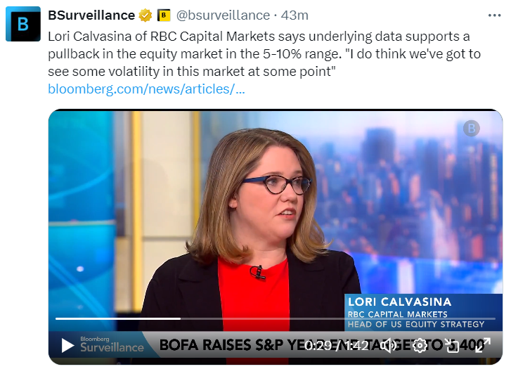 “人们一直问我会有多大,”RBC Capital Markets的Lori Calvasina说道,她在2024年标普500指数目标为5150点,使她成为彭博调查中最乐观的策略师之一。“我说,看,不能超过10%,因为超过10%就是增长恐慌了。”