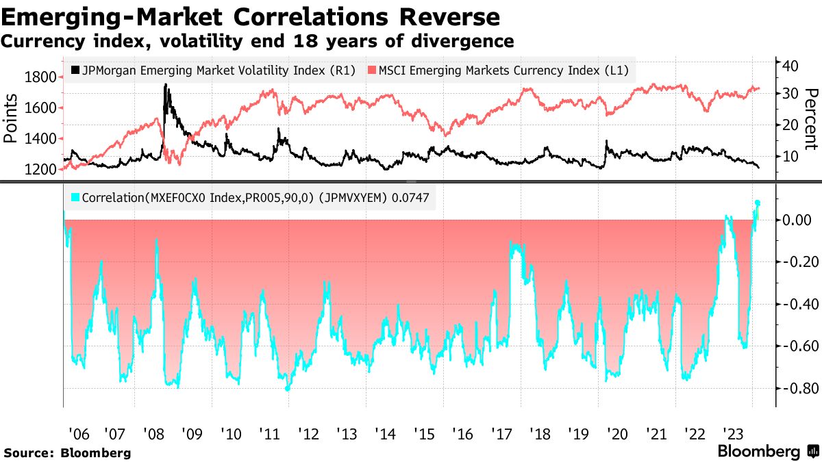 然而,奇怪的是,这种交易目前并不成功。自2006年以来,MSCI新兴市场货币指数和摩根大通新兴市场波动率指数已经停止了相反方向的波动,甚至显示出一种小幅正相关性。这导致了一种不寻常的情况,即波动性降至四年低点,但发展中国家货币并未上涨。事实上,许多货币正在贬值。