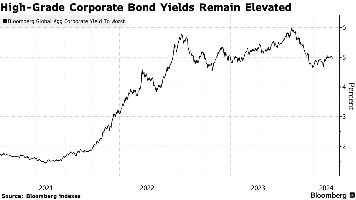 在近几周,随着投资者对央行降息的激进预期有所缓和,债券市场较安全部分的收益率有所上升。全球高评级公司债券的收益率略低于5%,比去年峰值低了约1个百分点,但高于今年年初的水平。