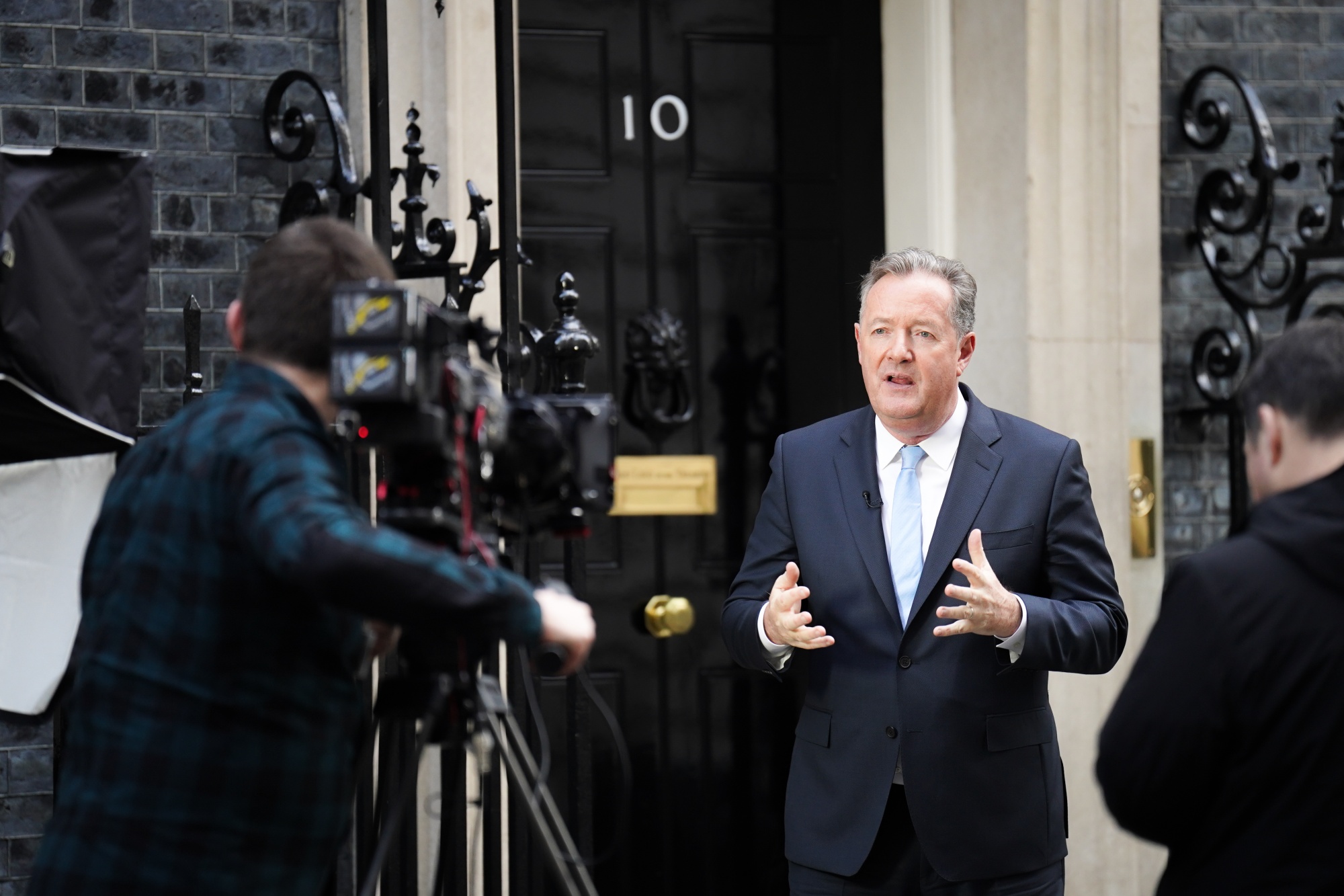 记者皮尔斯·摩根在伦敦唐宁街10号前为TalkTV拍摄。