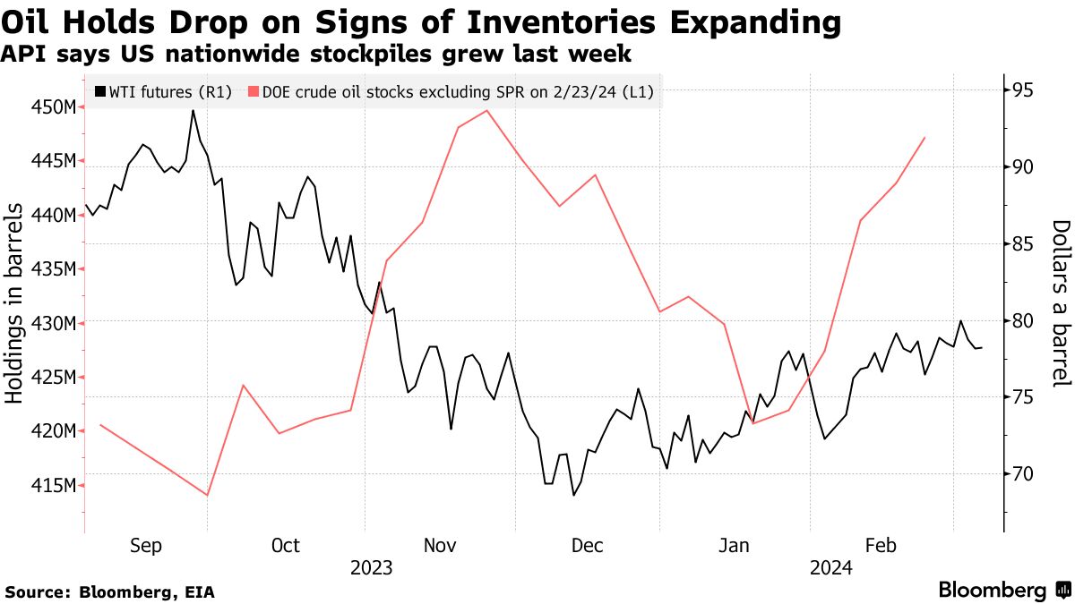 石油在下跌后稳定下来,一份报告显示美国库存继续扩大,这表明供应可能超过需求。