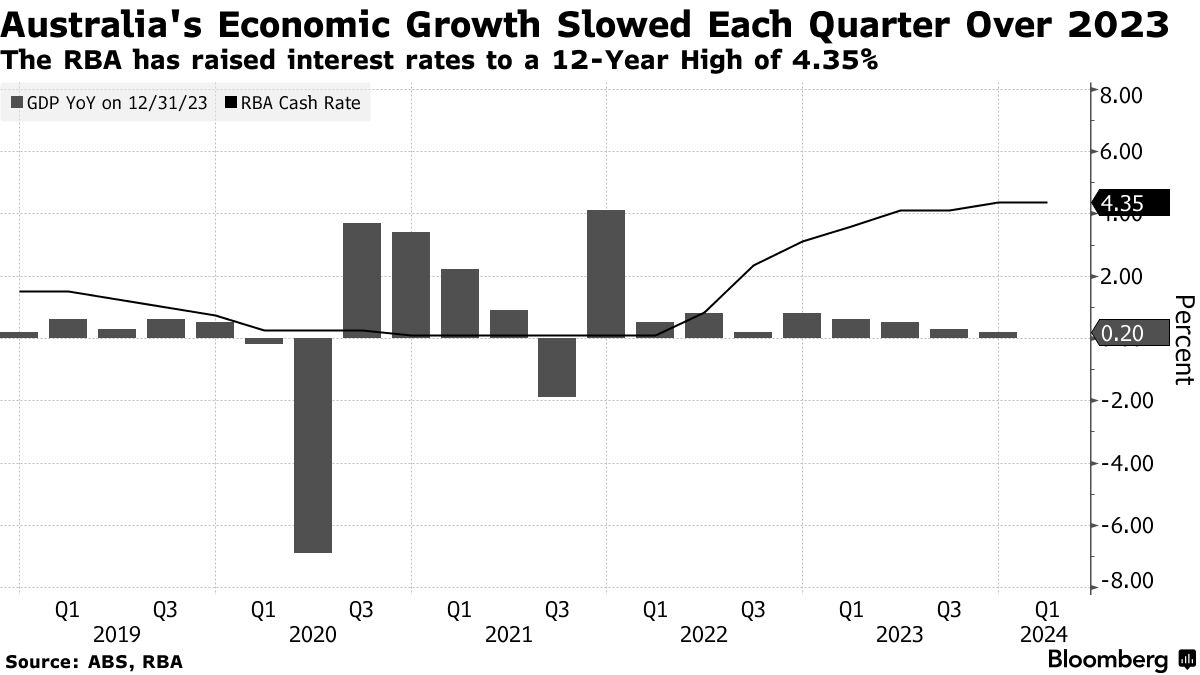 澳大利亚经济在去年最后三个月放缓,高利率和生活成本上涨拖累了家庭支出。
