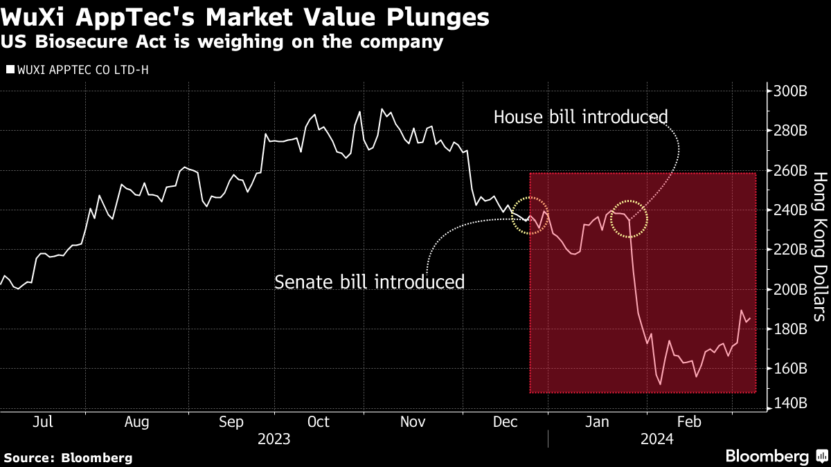 药明康德约66%的收入来自美国,这就是为什么在1月份有关该立法的消息传出后,其股价暴跌。药明生物,虽然没有被如此突出地提及,也受到了影响。这两家公司都否认与中国共产党有任何联系。