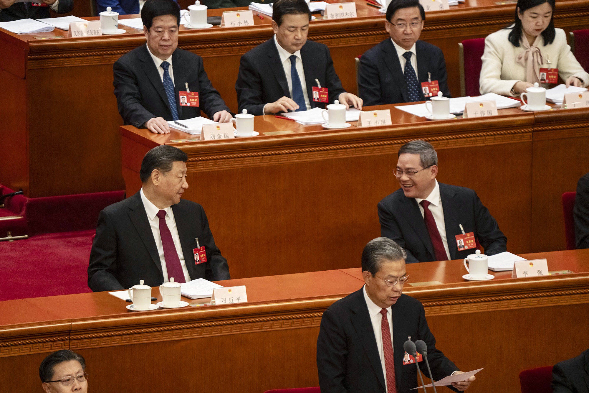 习近平(左)与李强(右)在2024年3月5日的北京全国人大会议上交谈。摄影师:Qilai Shen/Bloomberg 习近平