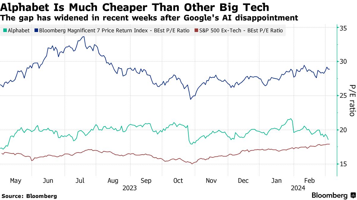 根据彭博编制的数据,Alphabet的前瞻收益为18倍。这比包括英伟达、苹果公司、微软、Facebook母公司Meta Platforms、特斯拉和亚马逊在内的更广泛的“辉煌七人组”要便宜约35%。