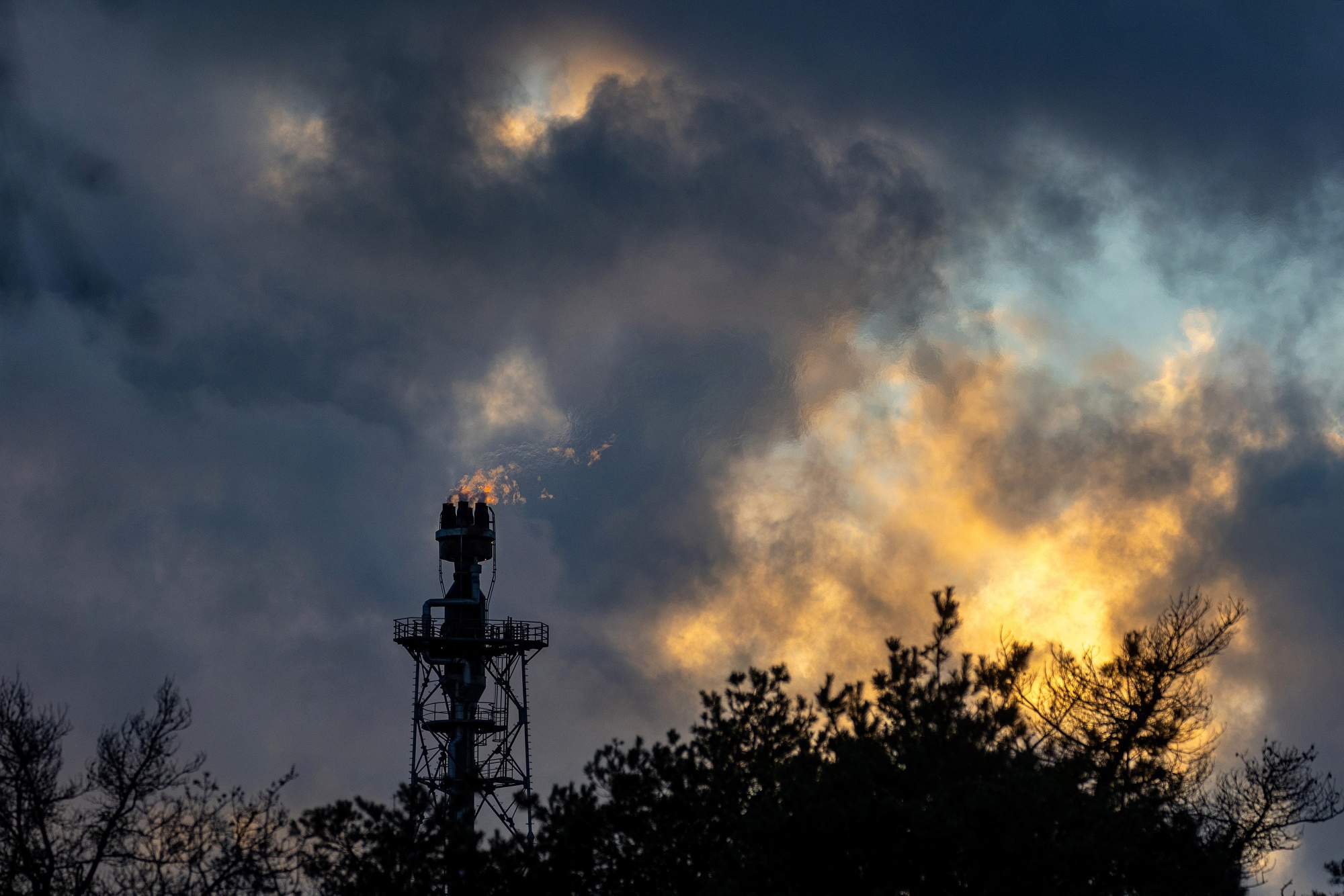 从德国Schwedt的PCK Raffinerie GmbH炼油厂的火炬塔释放出易燃气体。