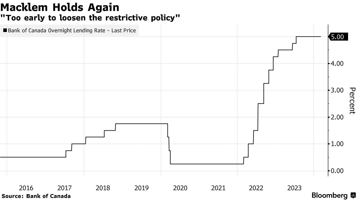 加拿大央行将利率维持在5%,表示现在讨论降息为时尚早 - 彭博社