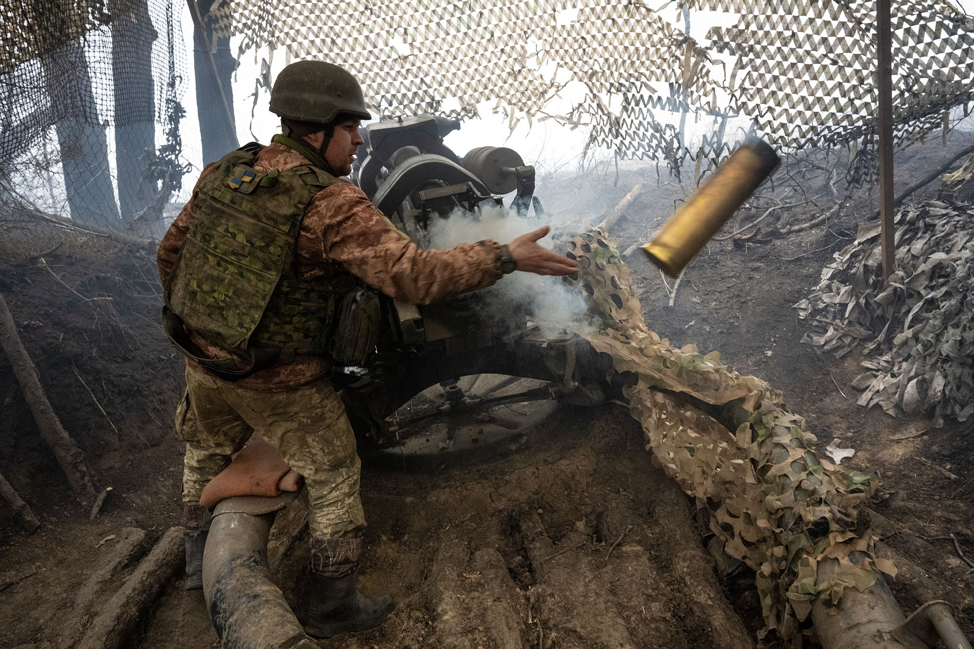 一名炮手在向俄罗斯在乌克兰的阵地开火后取出一个炮弹壳。