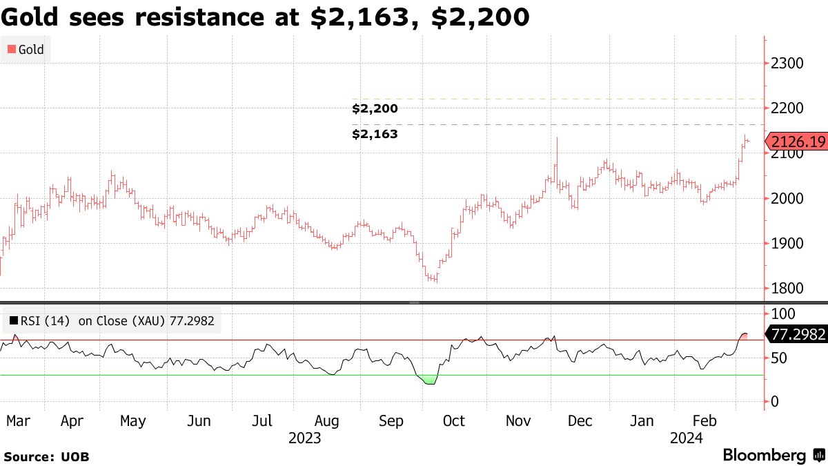 新加坡大华银行认为,下一个重要的阻力价位是2163美元,但对于StoneX金融有限公司市场分析主管罗娜·奥康奈尔来说,黄金已经超买,超过2115美元。她表示,上周末美国数据疲软引发了技术和动量交易,加上“随大流”的效应。