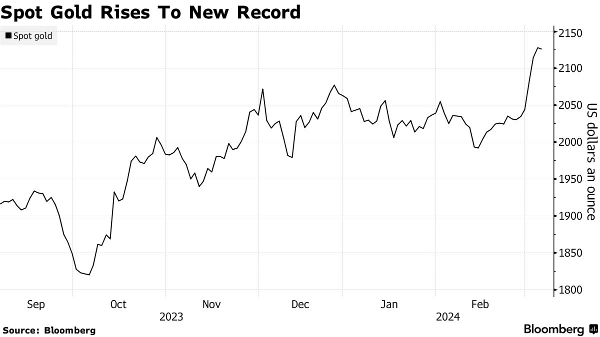 黄金突破了每盎司2088美元的阻力价位,周三达到每盎司2149.25美元的创纪录高点。