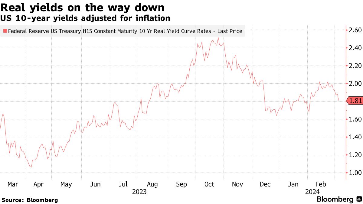 当美联储最终改变政策时,将降低持有黄金的机会成本,因为黄金不带利息。自去年十月以来,美国实际收益率一直在下降,但黄金最近的涨幅远远超出了预期。
