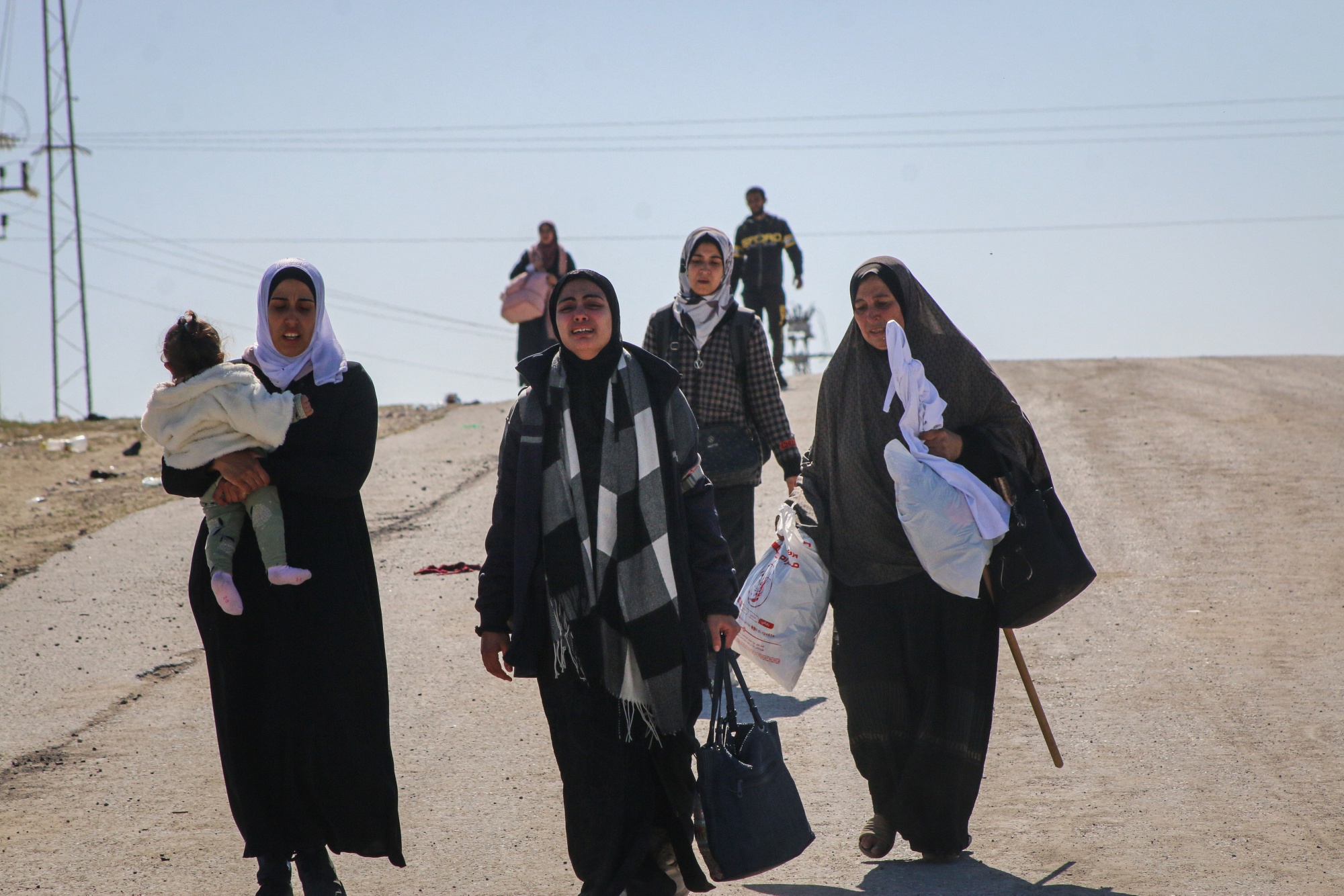 一名被迫离开家园的巴勒斯坦妇女在2024年3月5日穿过以色列坦克阵地后携带一面白旗进入加沙。