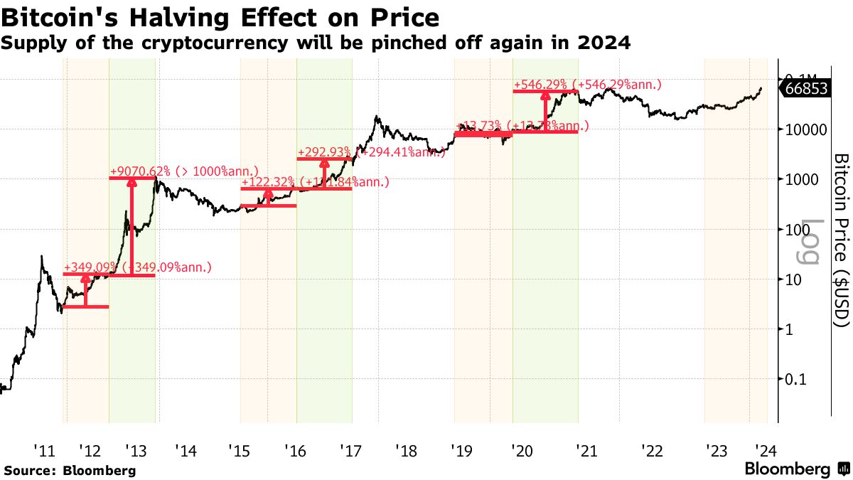 摄影师:Jordan Vonderhaar/Bloomberg比特币以其极度波动而著称,容易出现突然的价格飙升和迅速的逆转,可以在几分钟内抹去数百万美元的价值。这些变化常常让市场观察者感到神秘,因为这种数字货币与实际经济没有联系。比特币还有另一个怪癖,这是内置在赋予它诞生的代码中的:每隔一段时间,控制新代币创建速度的公式会发生变化。随着另一次这样的事件——被称为减半——的临近,比特币的支持者和怀疑者正在辩论它可能对硬币价值产生何种影响。在过去三次减半之后,硬币创下纪录,并在3月超过了之前的最高点68,991.85美元,从2022年的暴跌中回升。回归。