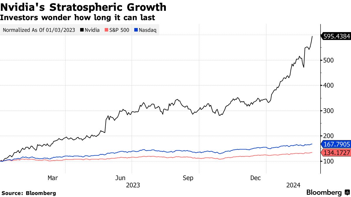 去年,英伟达的市值飙升了近240%,而2024年已经上涨了近80%。在66位跟踪英伟达的分析师中,没有一位建议客户出售股票,而有60位表示投资者应继续购买这些股票,根据彭博社编制的数据。