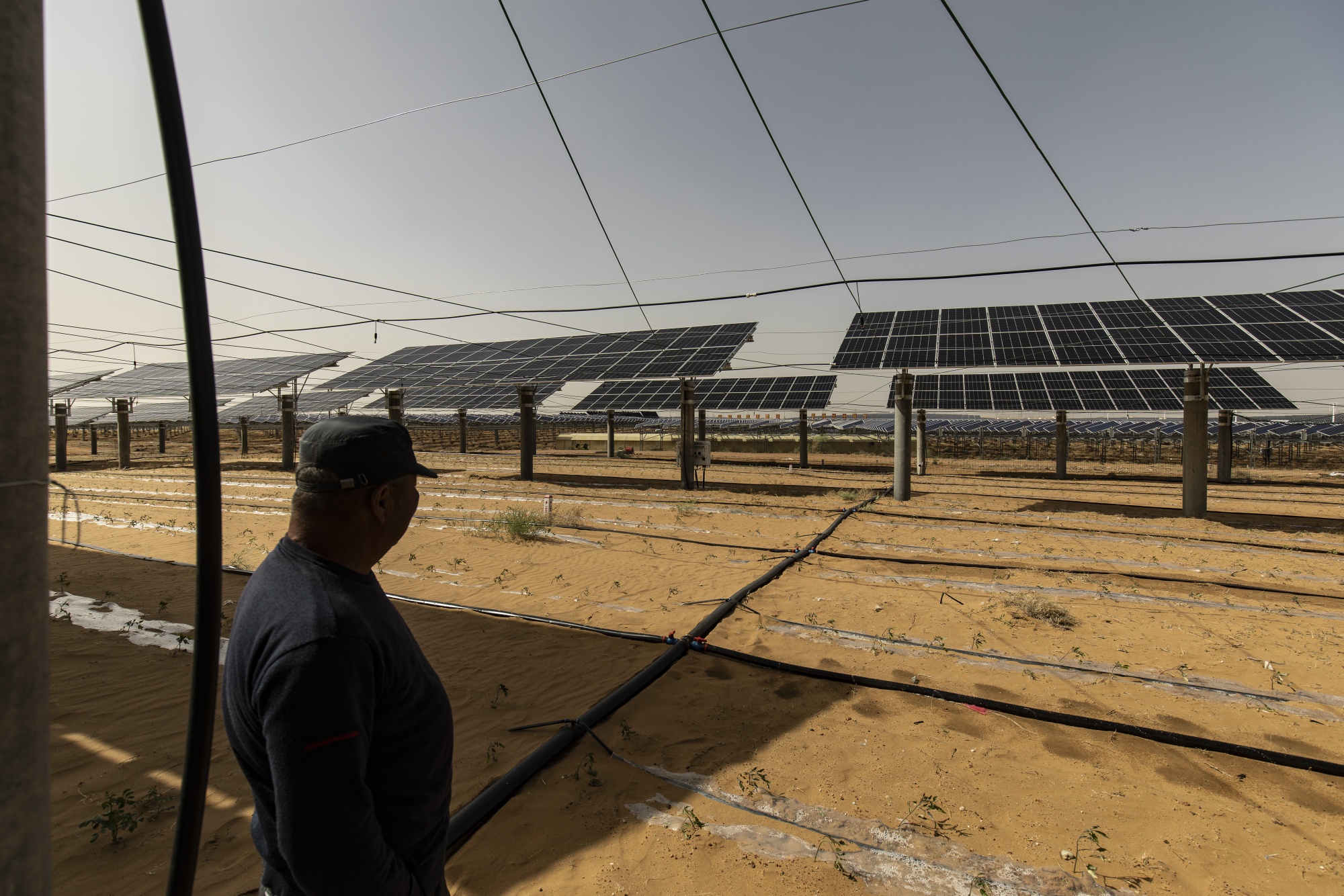 西瓜种植在内蒙古鄂尔多斯库布齐沙漠下的太阳能板下。