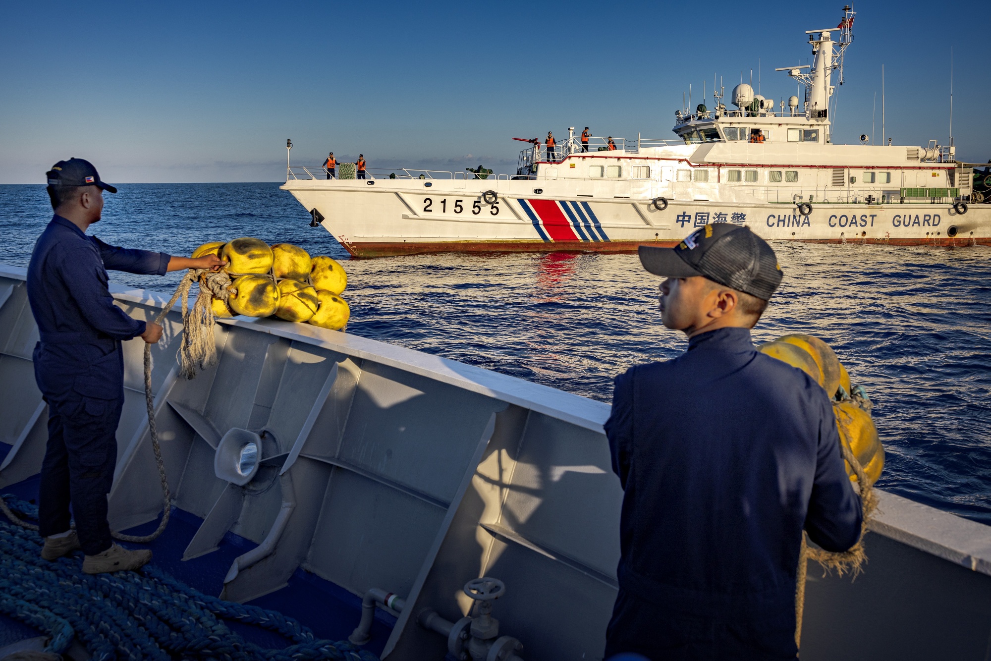 菲律宾海岸警卫队人员在3月5日准备与中国海警船在第二托马斯滩发生碰撞时部署防护垫。