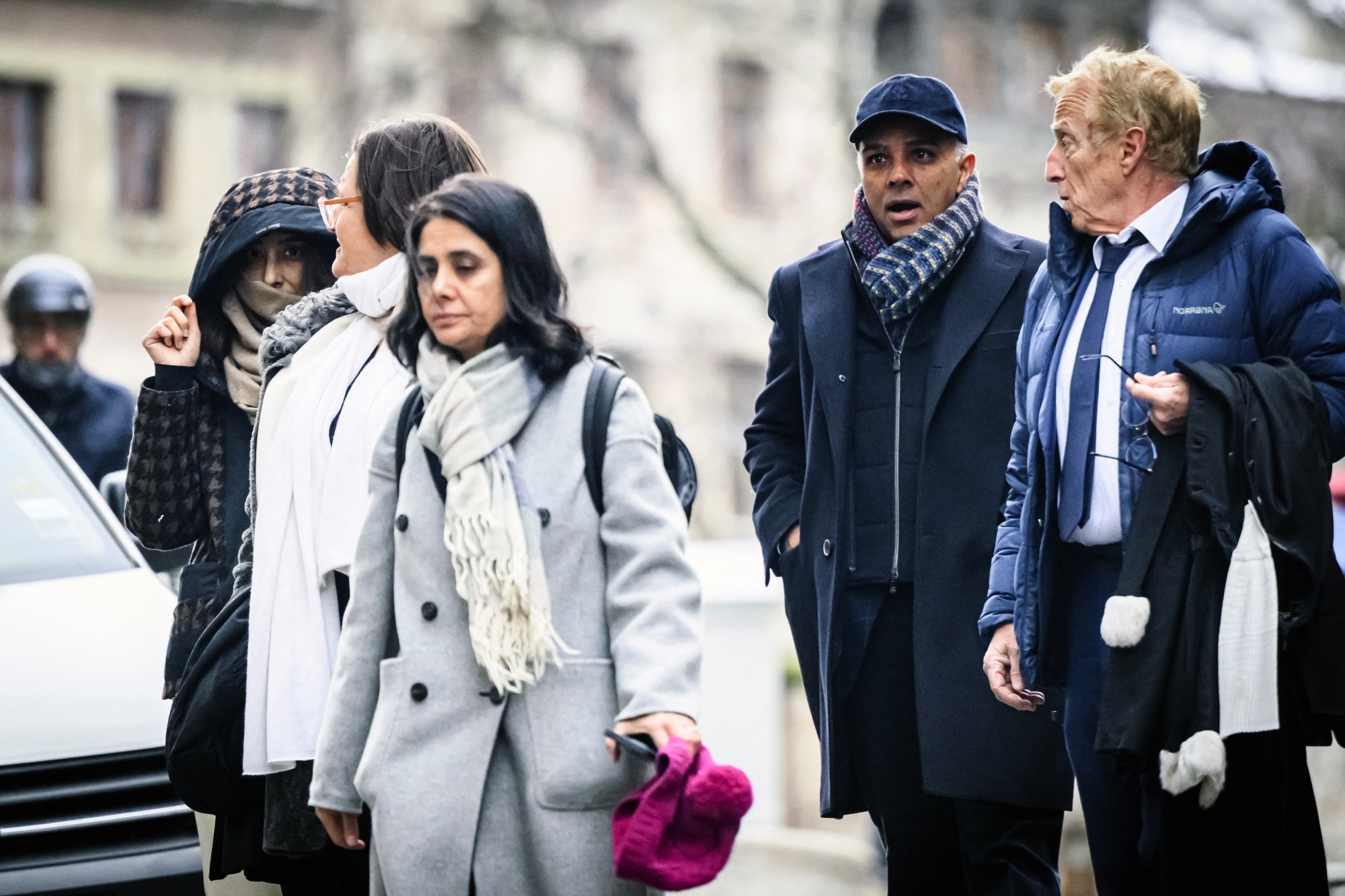 普拉卡什·辛杜加的儿子阿贾伊·辛杜加,右二,和他的妻子南玛塔,穿着带兜帽的夹克,于1月15日抵达日内瓦法院。摄影师:加布里埃尔·蒙内特/法新社/盖蒂图片社### 达沃斯之行