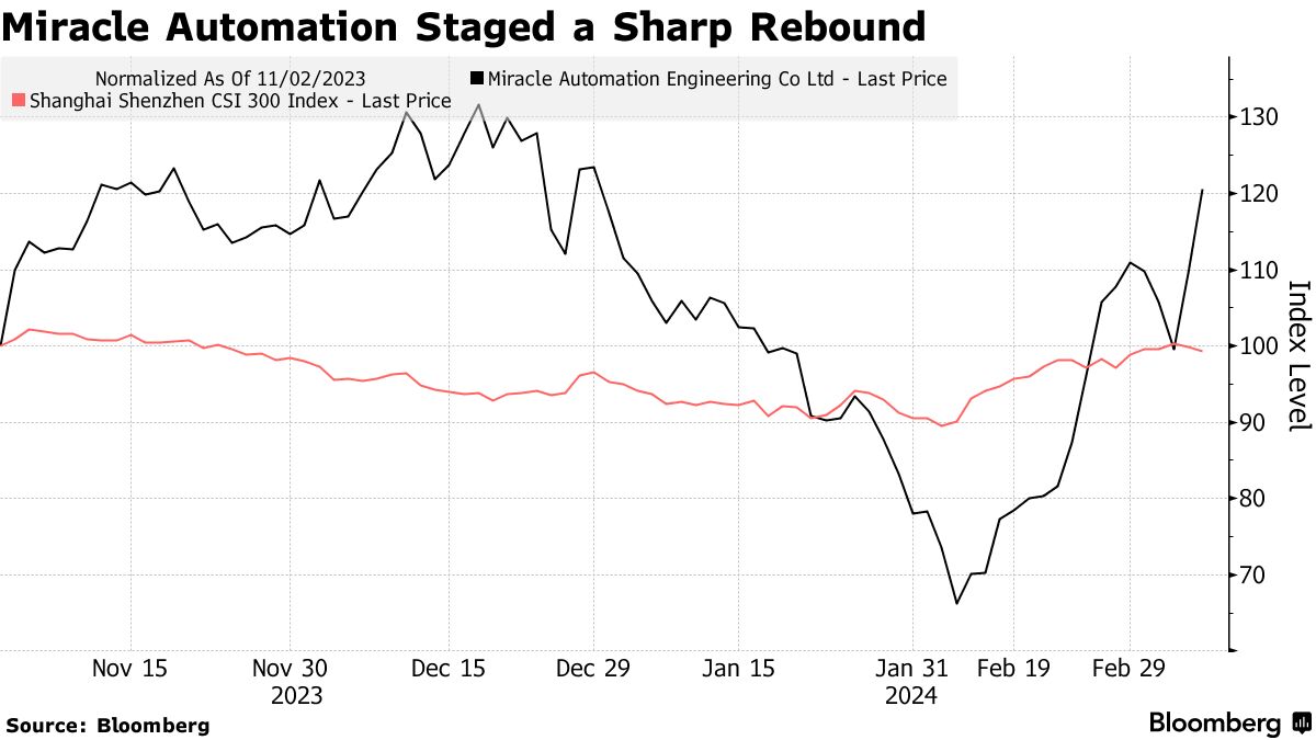 周二政府工作报告发布后,机器人公司股价飙升。奇迹自动化工程公司在随后的两个交易日内涨幅达到了10%的涨停板,而优必选机器人股份有限公司的股价翻了一番。习近平主席在11月上海访问期间被看到观看一款行走机器人的展览。