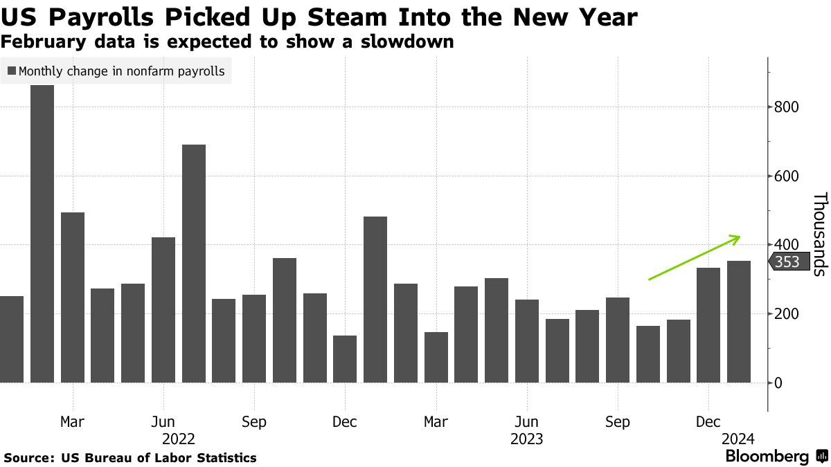 美国劳工统计局可能会在周五发布另一个强劲的就业报告,但数据显示二月份的招聘集中在几个行业,掩盖了劳动力市场的普遍降温,根据彭博经济学