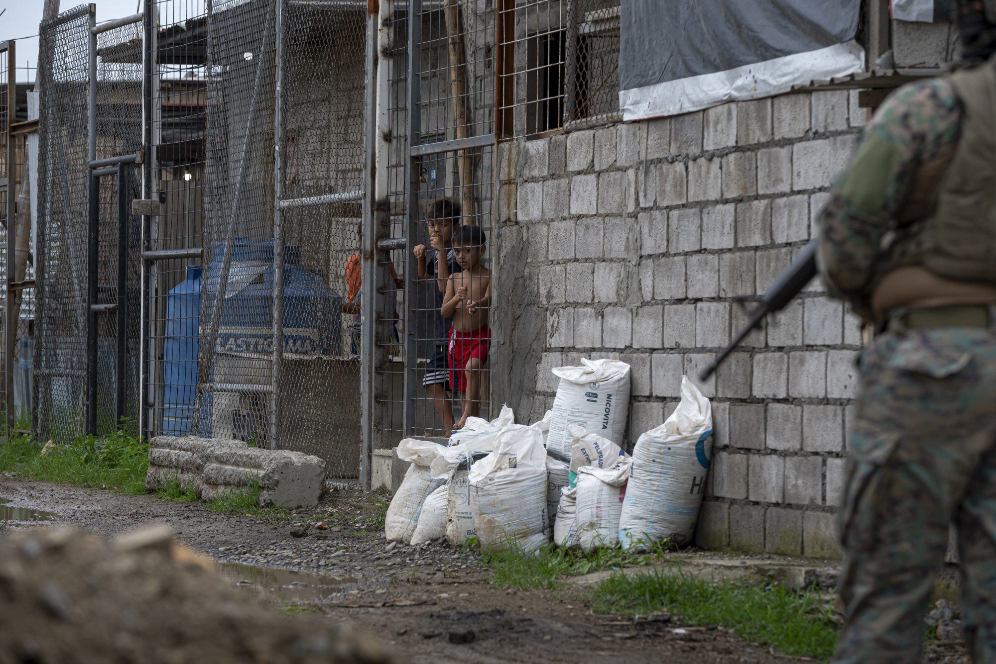 孩子们看着军警到达Durán, 厄瓜多尔进行家庭突袭,日期为2月1日。摄影师:Vicente Gaibor/Bloomberg诺博亚专注于帮派问题并使用紧急权力,似乎在效仿萨尔瓦多的纳伊布·布克莱的做法,后者是世界上少数比他更受欢迎的领导人之一。面对类似犯罪激增,布克莱通过大规模逮捕、暂停公民权利和建造世界上最大监狱之一来镇压帮派,成为地区英雄 —— 所有这些政策诺博亚都在采纳。
