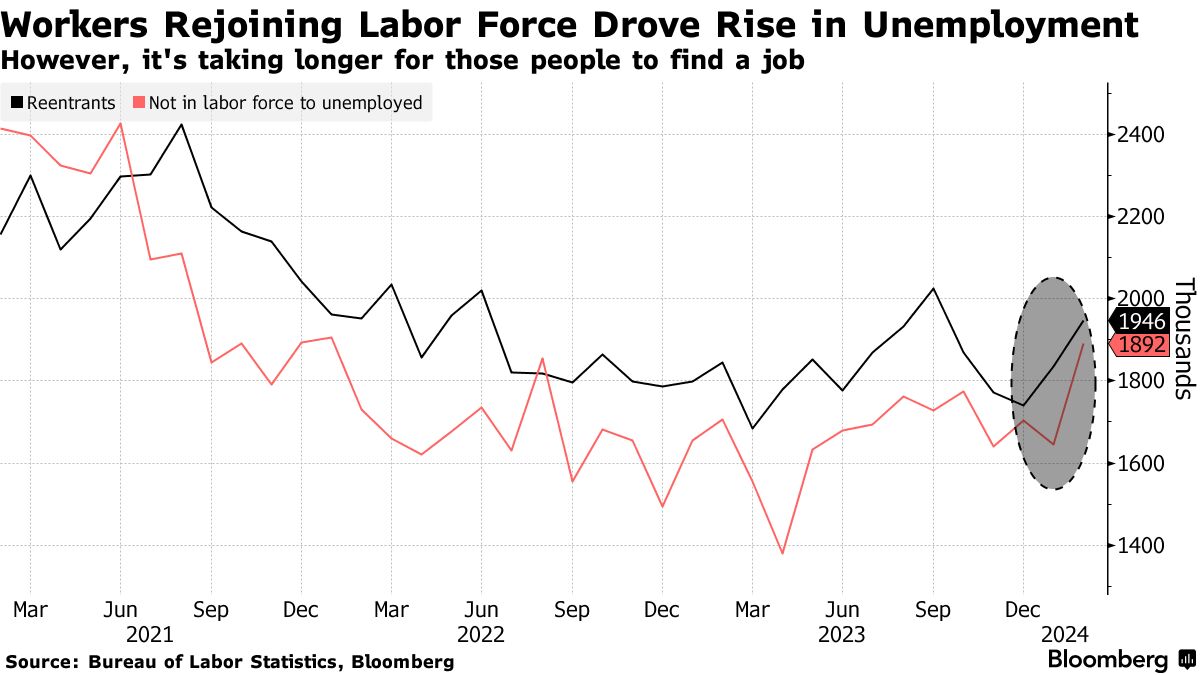 摄影师:Eric Thayer/Bloomberg根据劳工统计局的定义,要被视为失业,一个人必须积极尝试找工作 — 否则他们根本不属于劳动力市场。上个月,有很多人脱离旁观者角色加入劳动力市场 — 无论是第一次还是再次尝试 — 这有助于将失业率提高到3.9%,这是自2022年1月以来的最高水平。