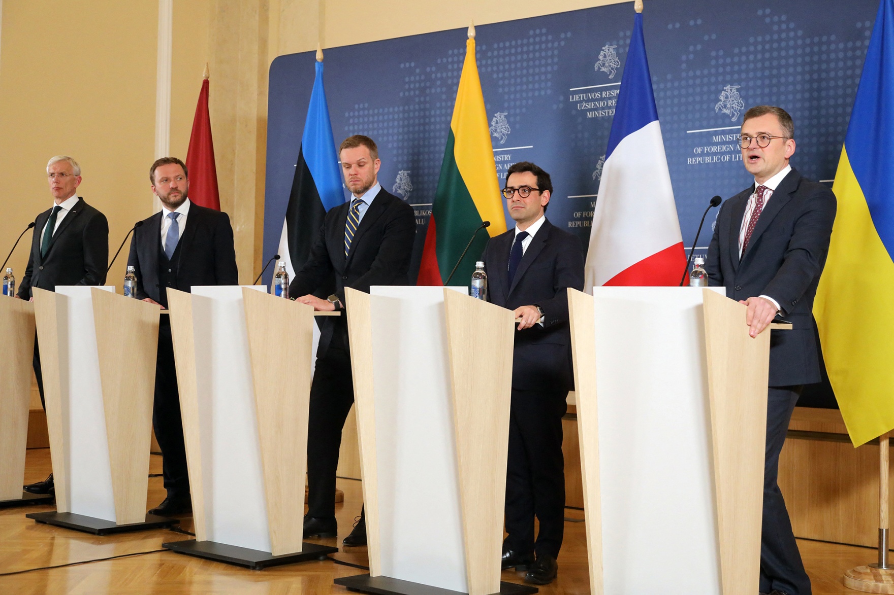 从左起,Krisjanis Karins,Margus Tsahkna,Gabrielius Landsbergis,Stephane Sejourne和Dmytro Kuleba在3月8日在立陶宛维尔纽斯举行会议后的联合新闻发布会上。