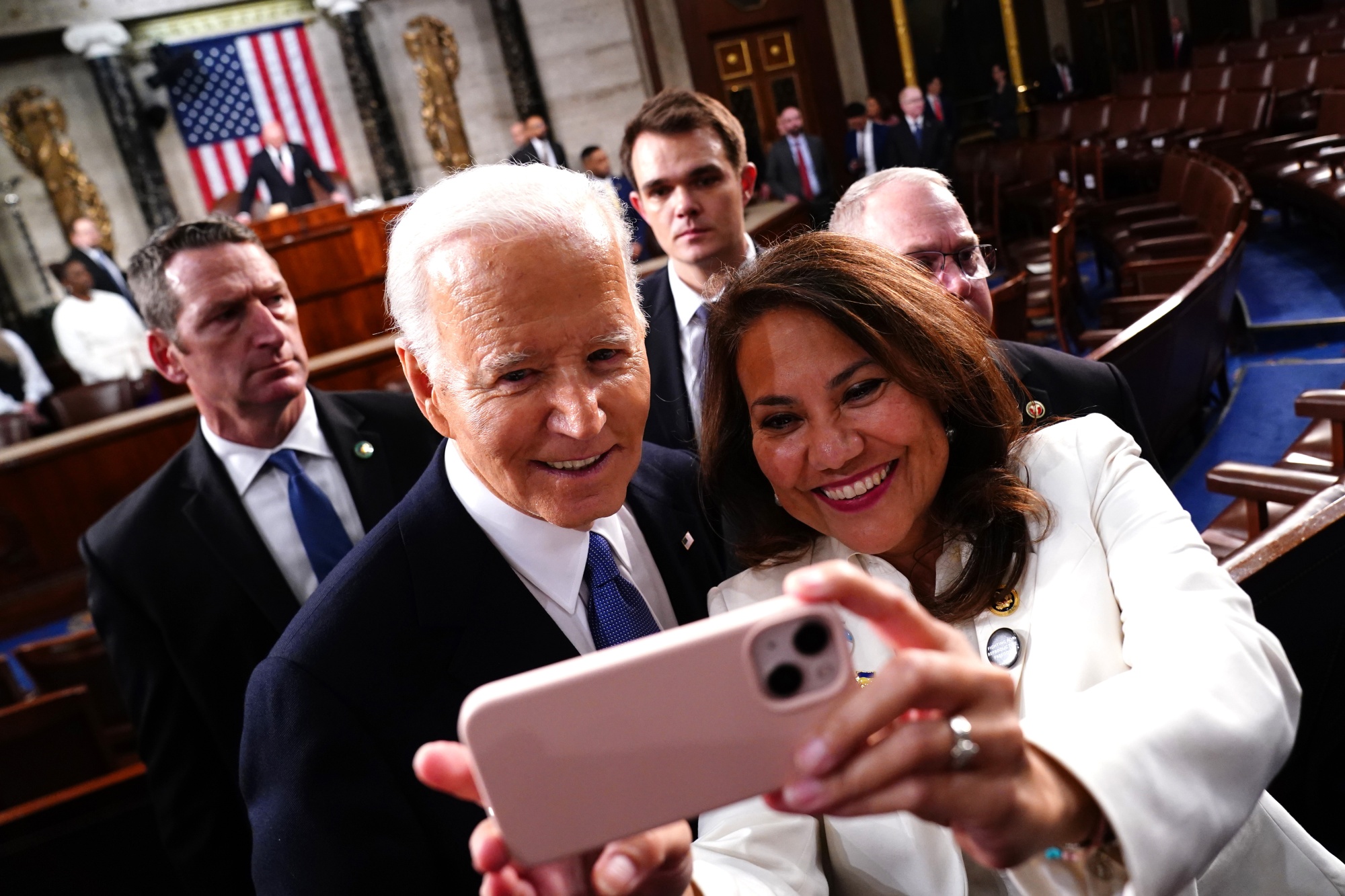 拜登与德克萨斯州国会议员维罗尼卡·埃斯科巴合影。摄影师:肖恩·特鲁/美联社彭博专栏作家妮娅-玛丽卡·亨德森高度评价了总统乔·拜登的国情咨文,称其有力、好斗、锐利且幽默。他的连任竞选活动还推出了一则新的电视广告取笑他的年龄,其中他说:“看,我非常年轻、充满活力和英俊 - 我到底在干什么?”