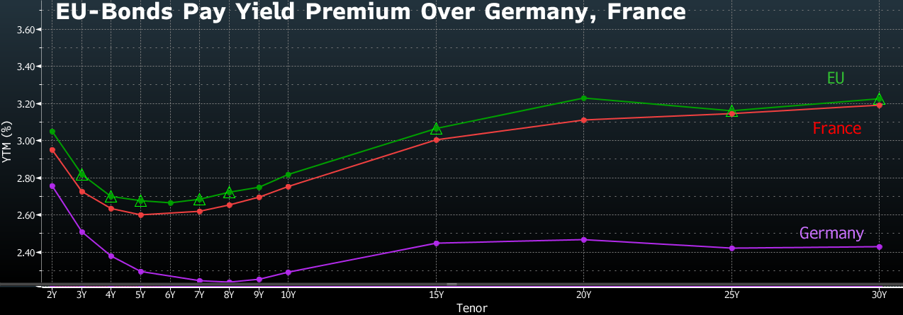 投资者敦促持保留意见的国家克服这些顾虑的一个原因是,AAA评级的债券备受青睐,尤其是自从去年美国被剥夺了最高评级以来。另一个额外的好处是,由于发行的临时性质等原因,现有的欧盟债券的收益率略高于同等评级的德国,甚至高于评级较低的法国。
