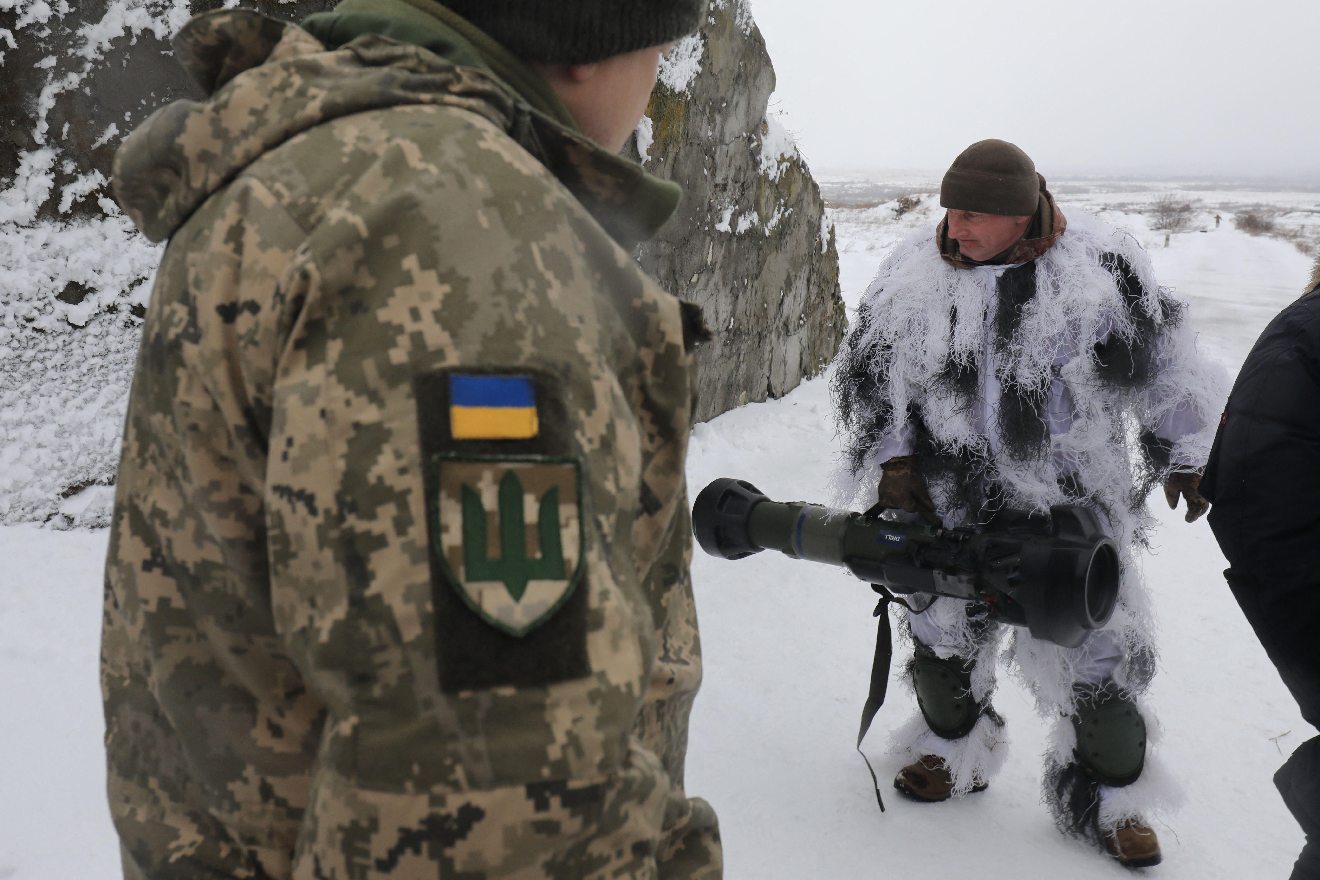 一名乌克兰军人在利沃夫附近携带下一代轻型反坦克武器。