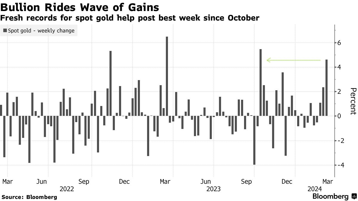 现货黄金刚刚度过自十月以来最佳周,当哈马斯袭击以色列时,报价接近每盎司2200美元,五天内上涨了4.6%。强劲的全球央行购买和对美联储今年将降息的押注支撑了上涨势头。降息将支持无息贵金属进一步上涨,并可能促使分析师修订年底预测。目前,中值预测为每盎司2100美元,低于当前现货价格。下一次美联储利率决定将于3月20日公布。