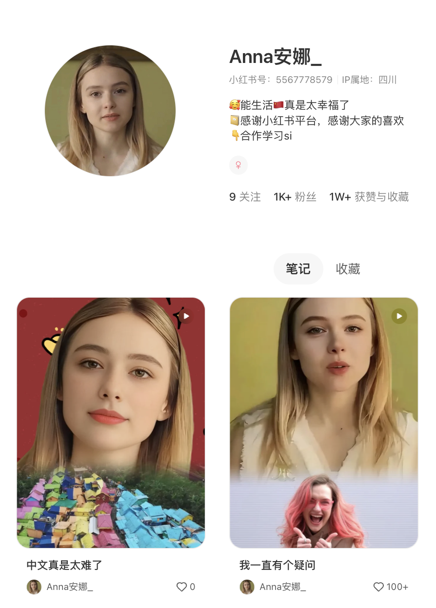 一大批其他影响者和名人被克隆,用来代言从语言应用到自助课程的各种产品,而且都没有得到他们的许可。但令人惊讶的是,洛伊克也被选中来做推广。她在YouTube上还比较新手,只在一个月内发布了八个视频,然后就开始出现深度伪造视频。洛伊克认为,她的克隆者可能被她“斯拉夫”外表所吸引,以吸引支持俄罗斯的中国消费者。“这个观众可能会喜欢我的虚拟形象…最终他们更有可能购买产品,”她说。她说,这些深度伪造视频数量达到了数百个,传播到了中国Instagram风格平台小红书和视频分享网站哔哩哔哩。这里有一个例子: