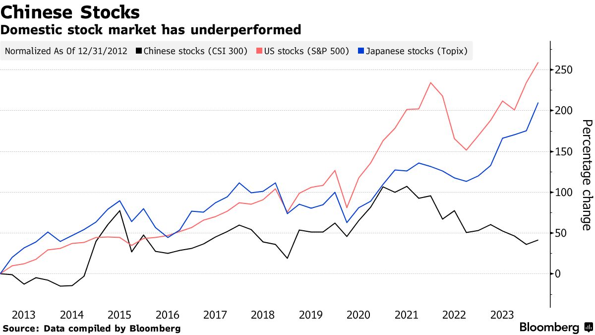 将资金投入中国对国内外投资者来说越来越不具吸引力。该国股市是全球表现最差的之一,连续三年下跌。最近一次崩盘使股票从2021年的峰值下跌了7万亿美元,信心危机不断加剧。