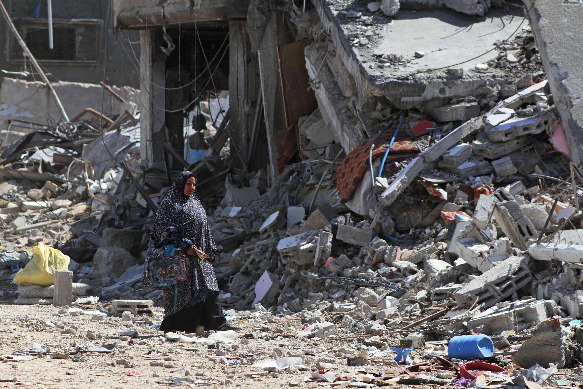 一名巴勒斯坦妇女周五穿过加沙南部汉尤尼斯被摧毁建筑的废墟。摄影师:Ahmad Salem/Bloomberg### 全球必读