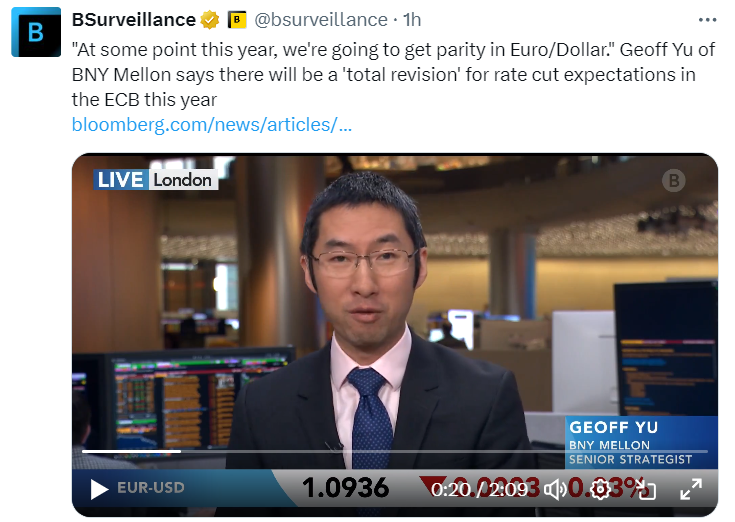 “我仍然坚持我的观点,今年某个时候我们将看到美元与欧元平价,”Yu今天早上在监控上说。
