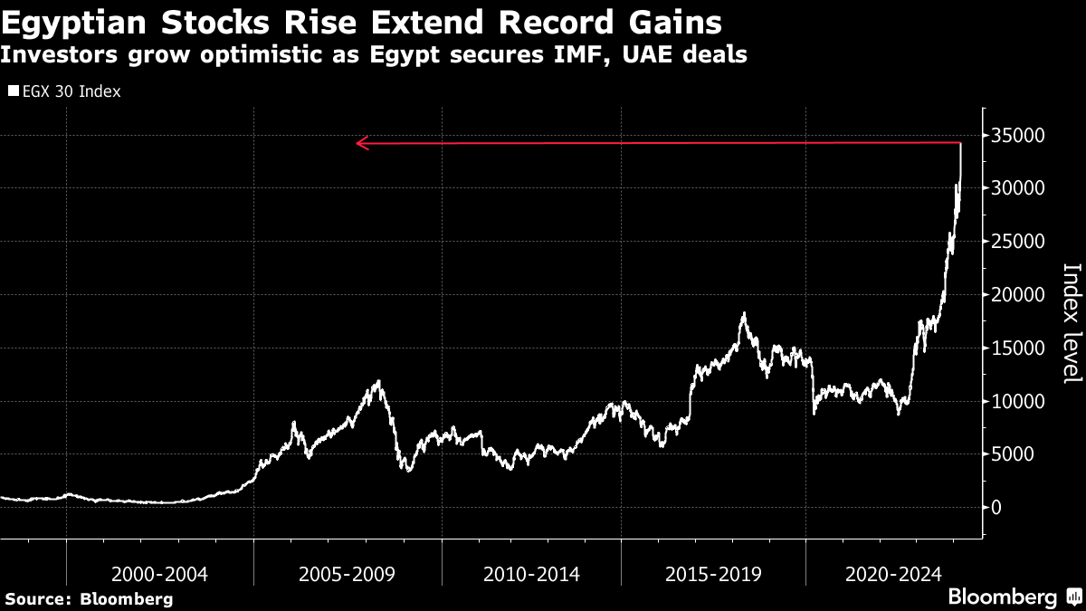周三,中央银行实施了期待已久的货币贬值,使埃及镑对美元贬值超过38%。监管机构还进行了有史以来规模最大的600个基点的利率上调。几小时内,政府宣布与国际货币基金组织达成协议,将其贷款增加到80亿美元以上。