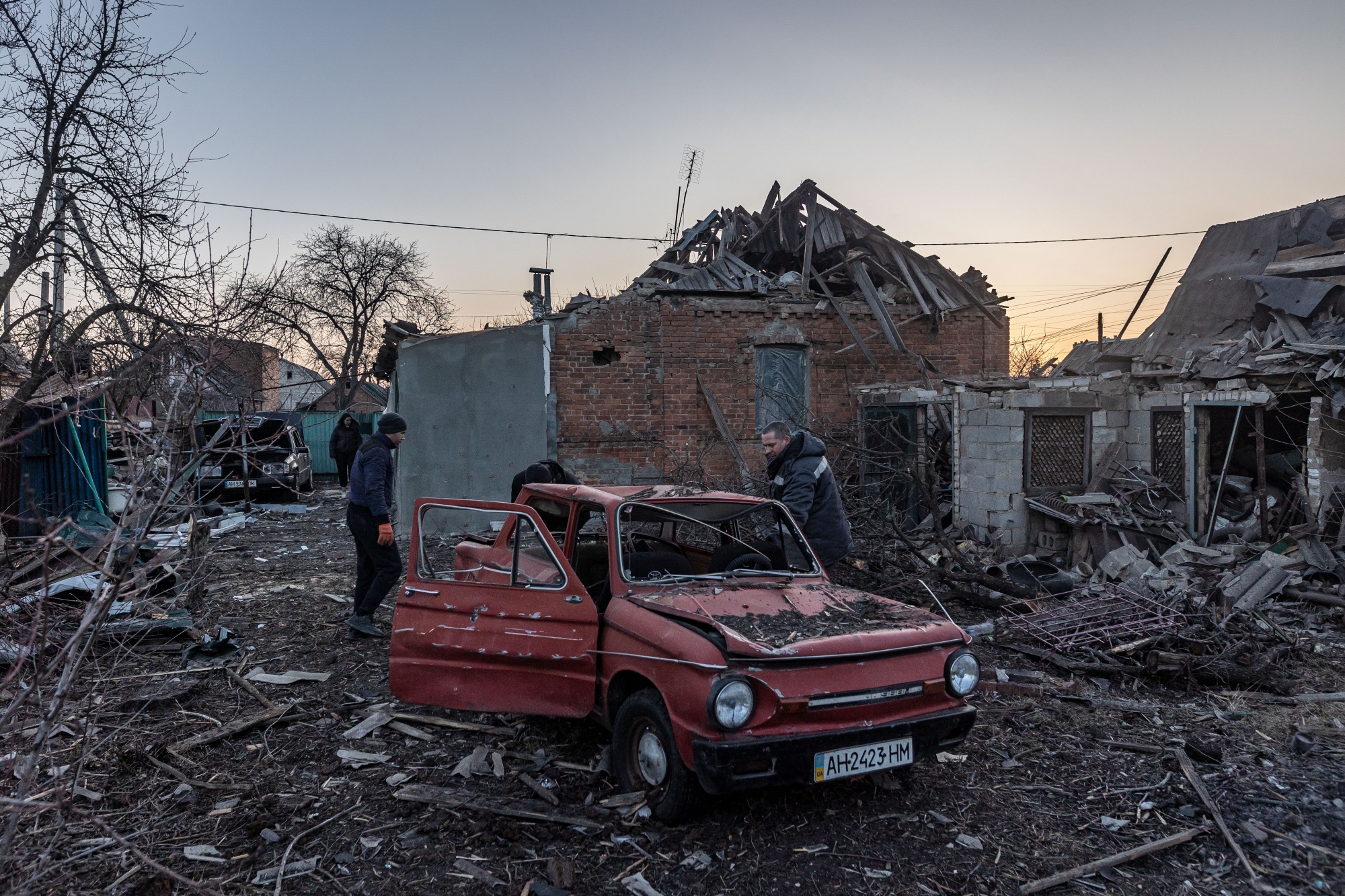 居民们在乌克兰科斯蒂安尼夫卡遭受俄罗斯炮击后翻找残骸,时间是3月7日。