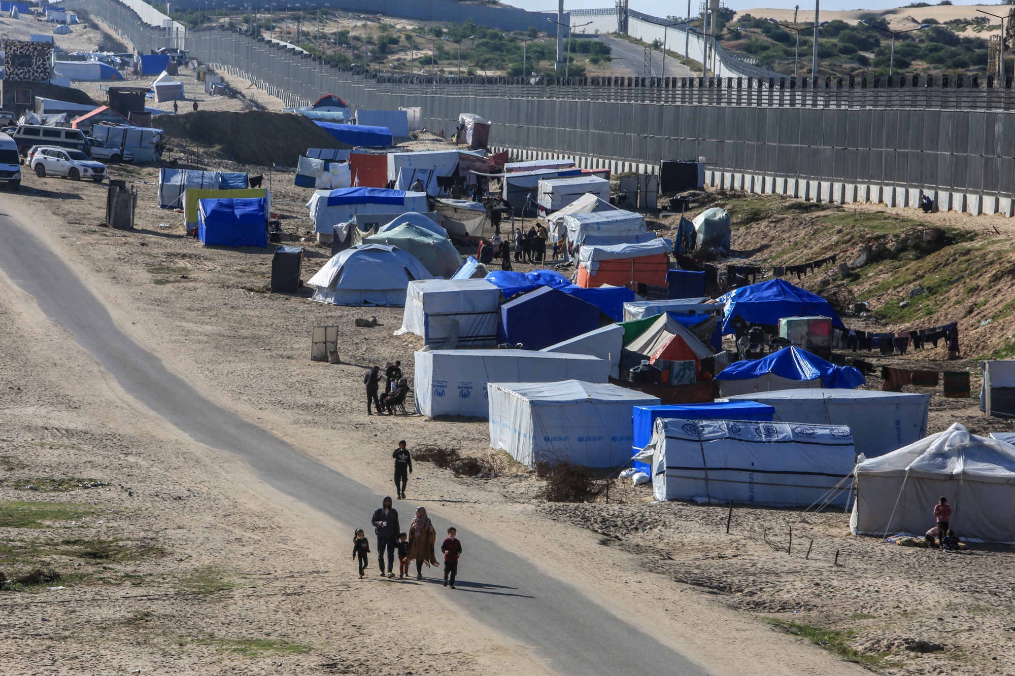 人们在3月8日走过设在埃及边境附近的拉法区的临时帐篷。