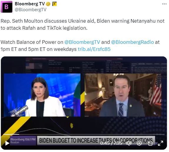 今天在彭博电视台的权力平衡早间版节目中,主持人乔·马修和凯莉·莱因兹采访了民主党众议员塞斯·莫尔顿,谈论众议院当前一轮预算谈判、对乌克兰和以色列的援助以及TikTok的未来。