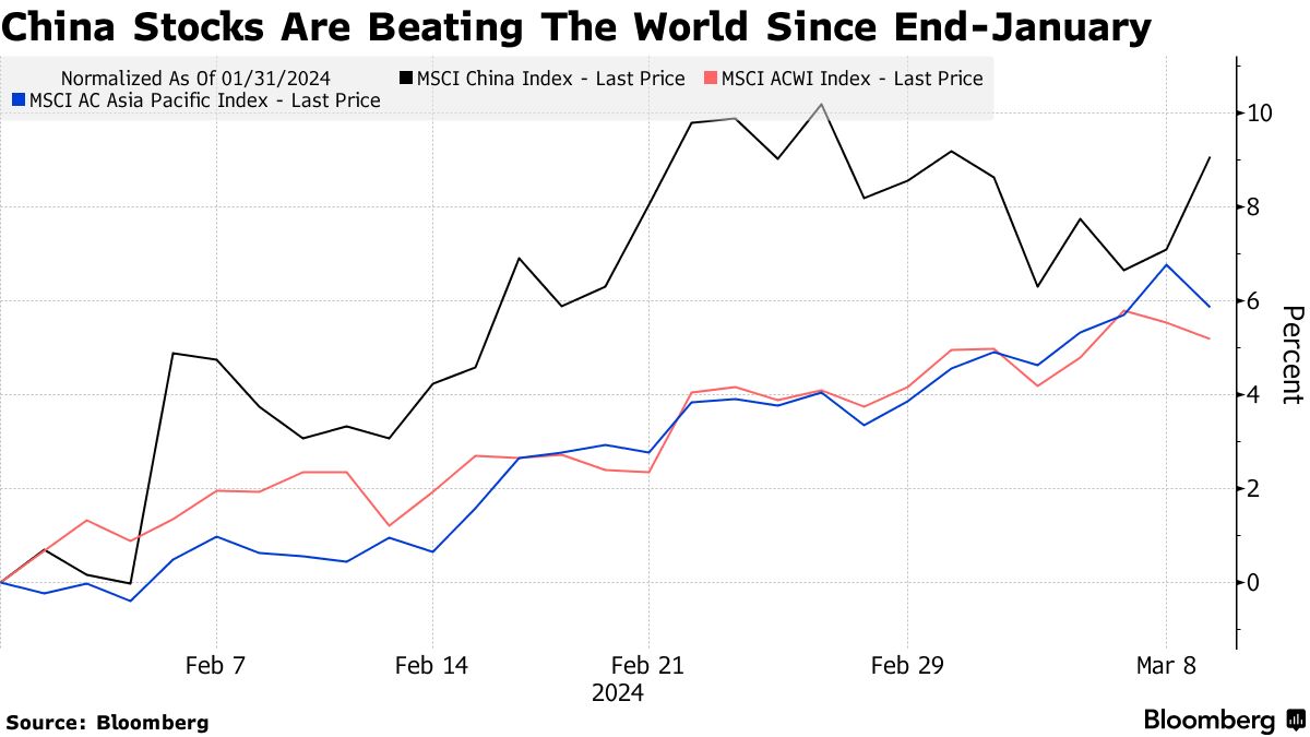 中国A股的CSI 300指数自2月2日触及五年低点以来已经上涨了近13%,而恒生中国企业指数自1月中旬以来已经上涨了约15%。