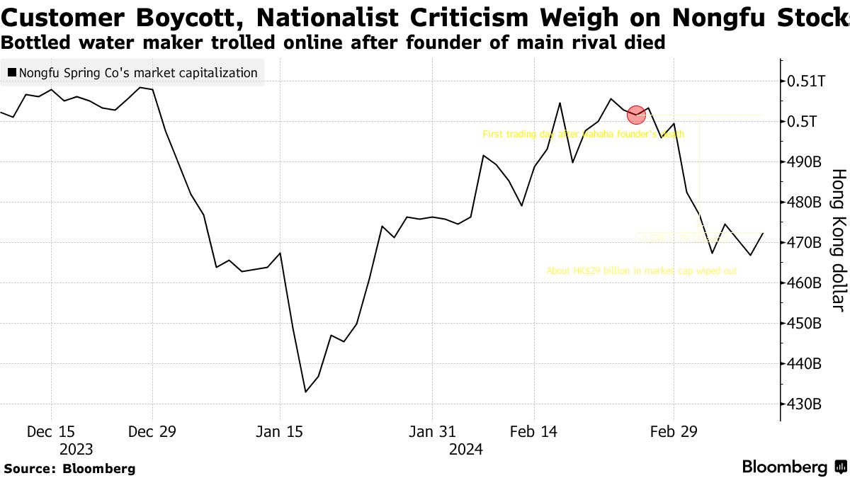 在本地平台上,网民们呼吁抵制农夫山泉的产品,此前关键竞争对手杭州娃哈哈集团有限公司的创始人于2月25日去世,引发了一波不利比较。这导致其股价下跌了近6%,成为恒生中国企业指数表现最糟糕的之一。