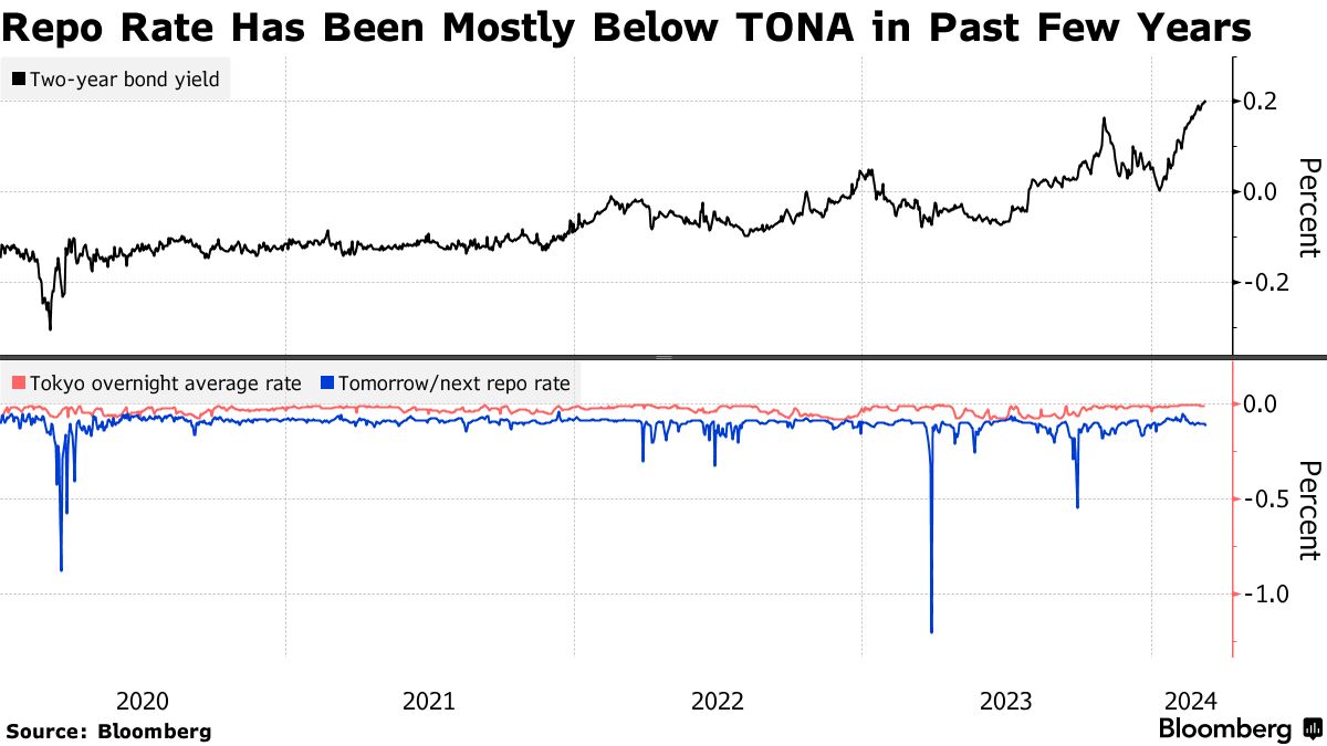 回购利率目前低于东京隔夜平均利率,通常称为TONA。直到2013年,日本银行切换制度之前,它是央行政策操作的目标,当时的行长是黑田东彦。一些策略师认为日本银行将把目标改回TONA。