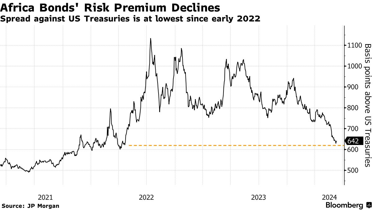 这使得非洲债务风险溢价与美国国债之间的平均差距降至自2022年4月以来的最低水平。