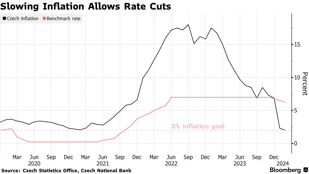 通胀回落促使该地区的央行开始进行货币宽松周期,布拉格的决策者加入了匈牙利和波兰等地区同行降息的行列。