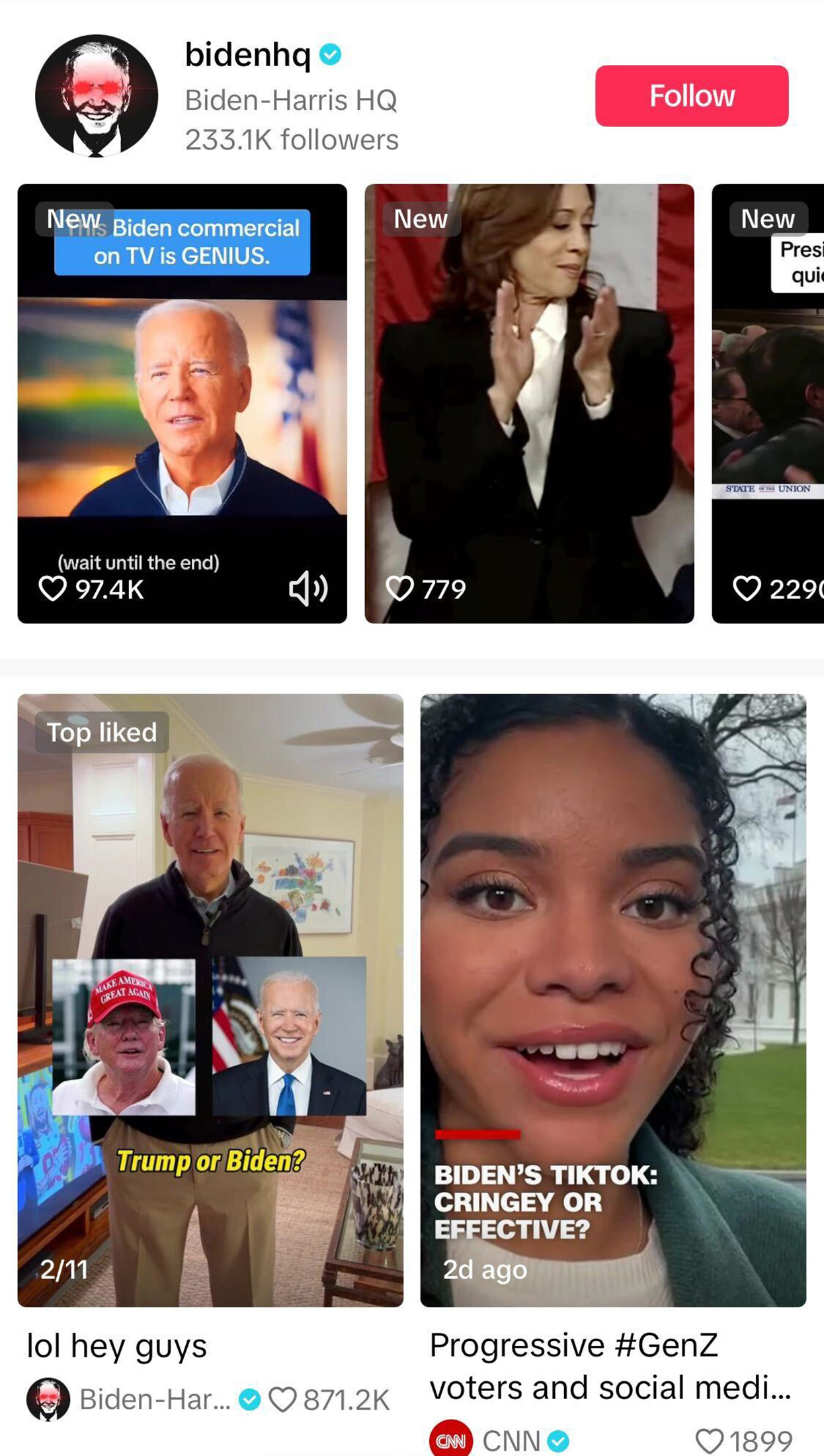 乔·拜登总统的连任竞选活动在超级碗期间开设了一个TikTok账号。自那时以来,该竞选活动已经发布了30多次视频,粉丝增长到201,000人,观看次数达到180万次。虽然这些视频涉及政策问题,比如堕胎权利,但它们也倾向于利用互联网俚语和表情包,将总统塑造成平易近人的形象。在其中一个视频中,他瞪大眼睛,假装畏缩,当他在国情咨文之前被佐治亚州的共和党众议员玛乔里·泰勒·格林(Marjorie Taylor Green)戴着MAGA帽子对峙时。视频的标题写着:“拜登总统对玛乔里·泰勒·格林的反应就是我们所有人的反应。”