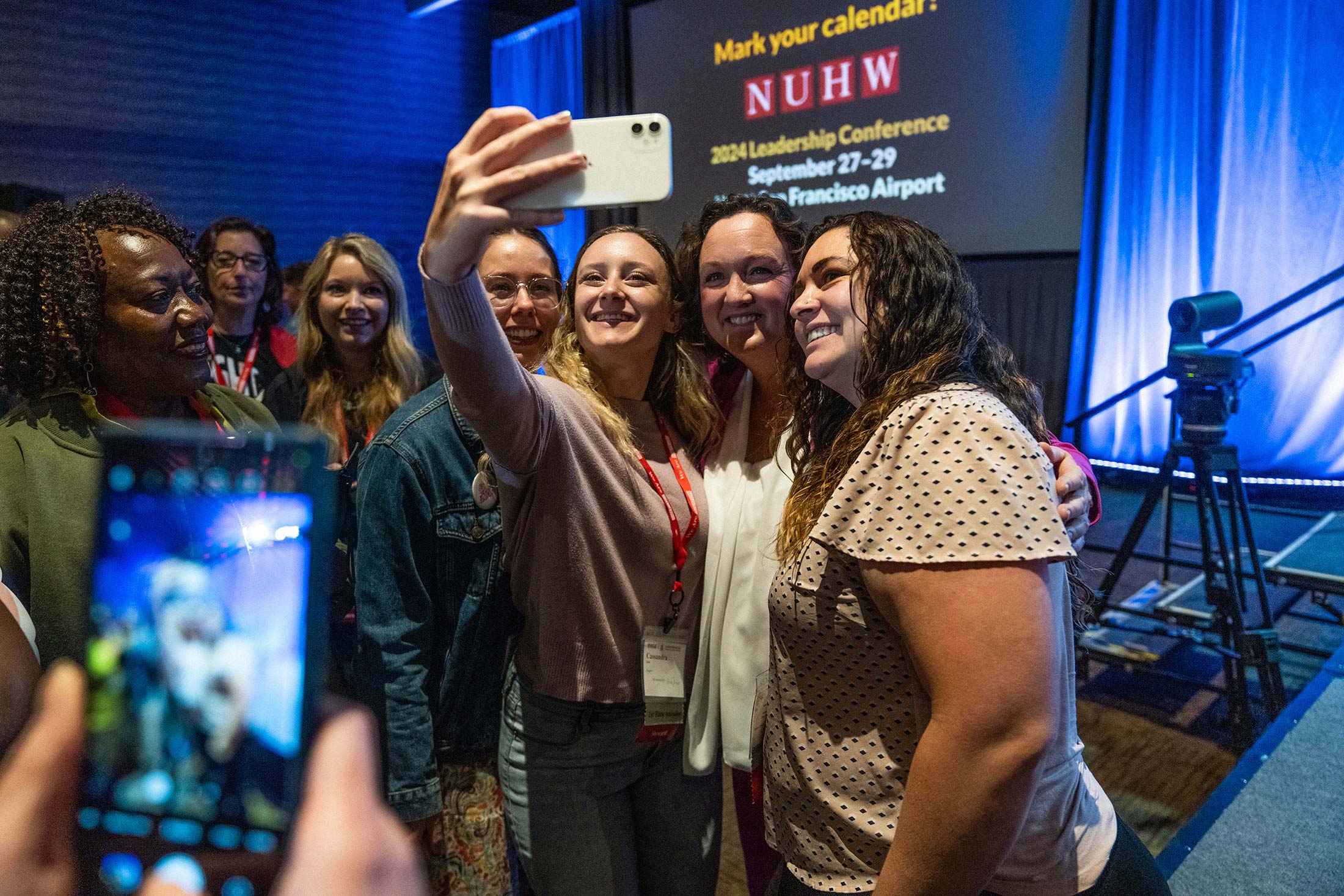 代表凯蒂·波特(右二)在2023年10月8日洛杉矶举行的全国医护工会参议员候选人论坛后自拍。