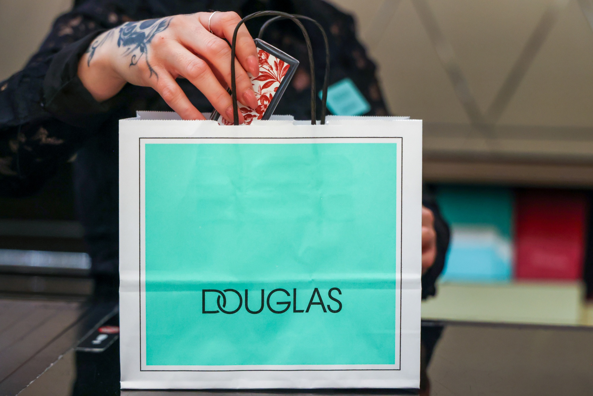 一名员工在德国法兰克福的道格拉斯商店为顾客将购买的物品放入袋子中