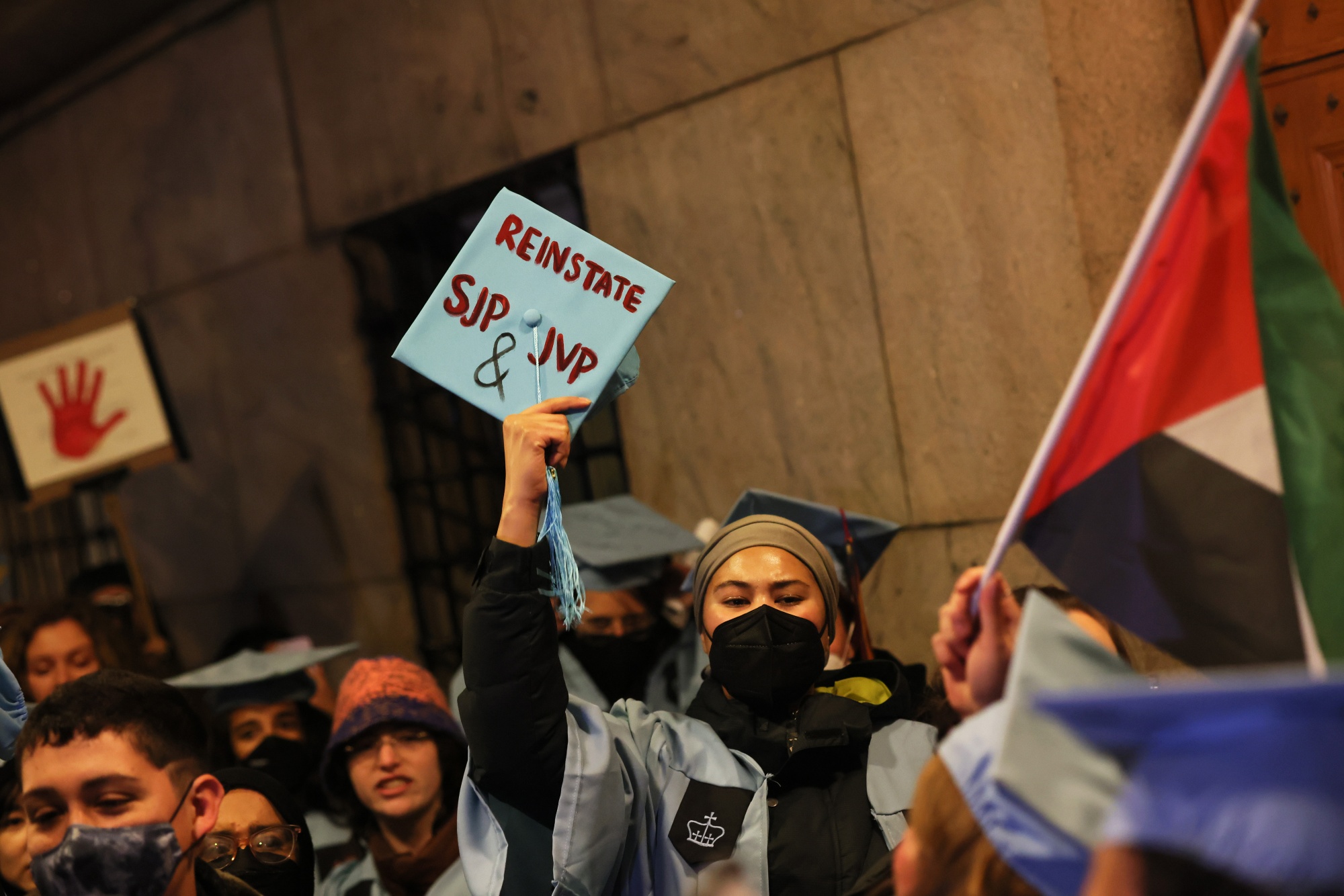 人们在2023年哥伦比亚大学抗议禁止正义学生会(SJP)和犹太和平之声(JVP)。