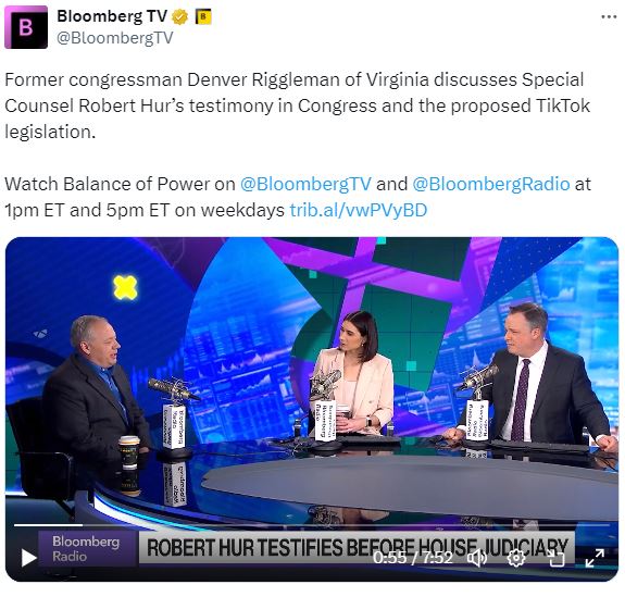 今天在彭博电视台的权力平衡 早间版节目中,主持人乔·马修和凯利·莱因兹采访了前众议员丹佛·里格尔曼,谈到了特别检察官罗伯特·赫尔在国会作证以及提出的TikTok立法。