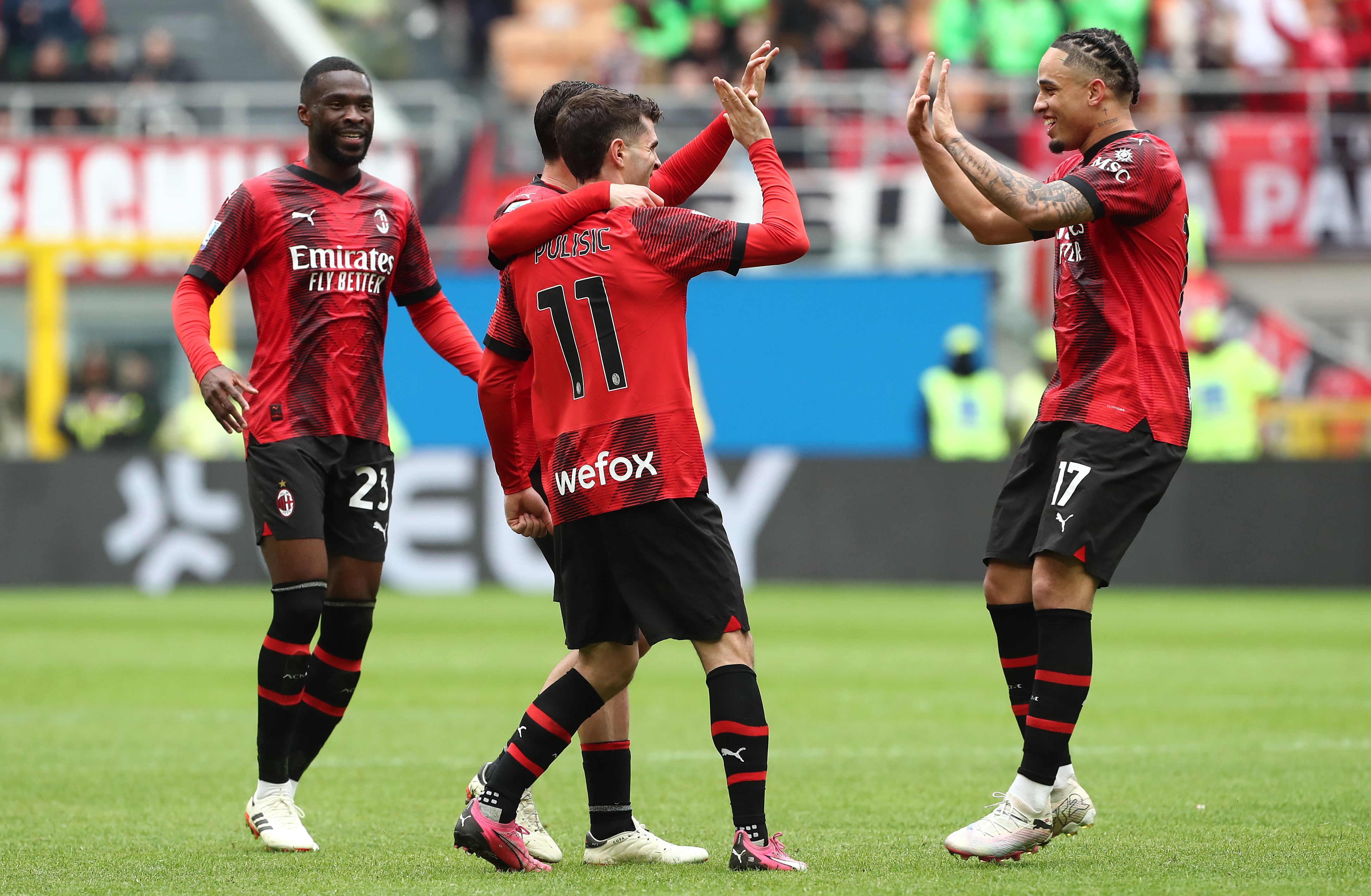 AC米兰队友们在3月10日对阵Empoli FC比赛中庆祝进球。